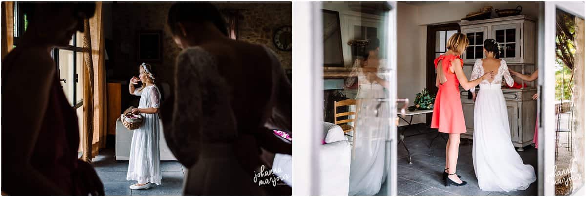 Pendant que les témoins mettent la main à la pâte pour finir de préparer les brochettes de fruits du Vin d’Honneur, finalisent la cérémonie laïque, s’installent dans leur chambre ou se refont une beauté, la mariée se fait pomponner dans une des superbes pièces du Mas. J’en profite pour photographier ses DEUX robes de mariée…Une courte et simple pour la cérémonie civile et une adorable pour la cérémonie laïque.
